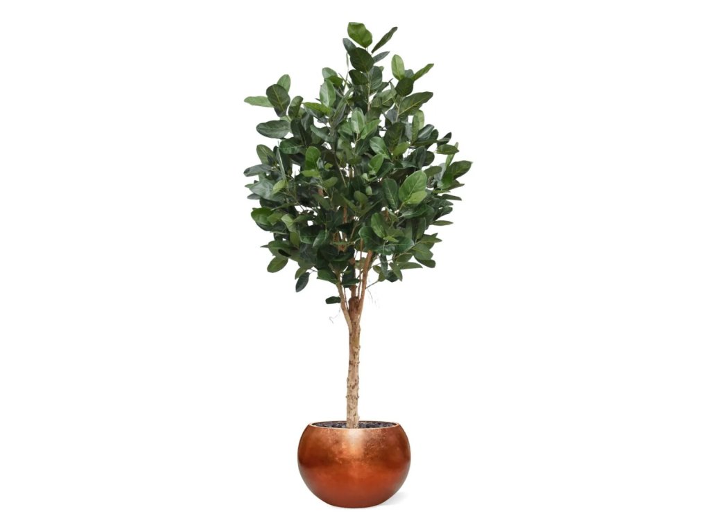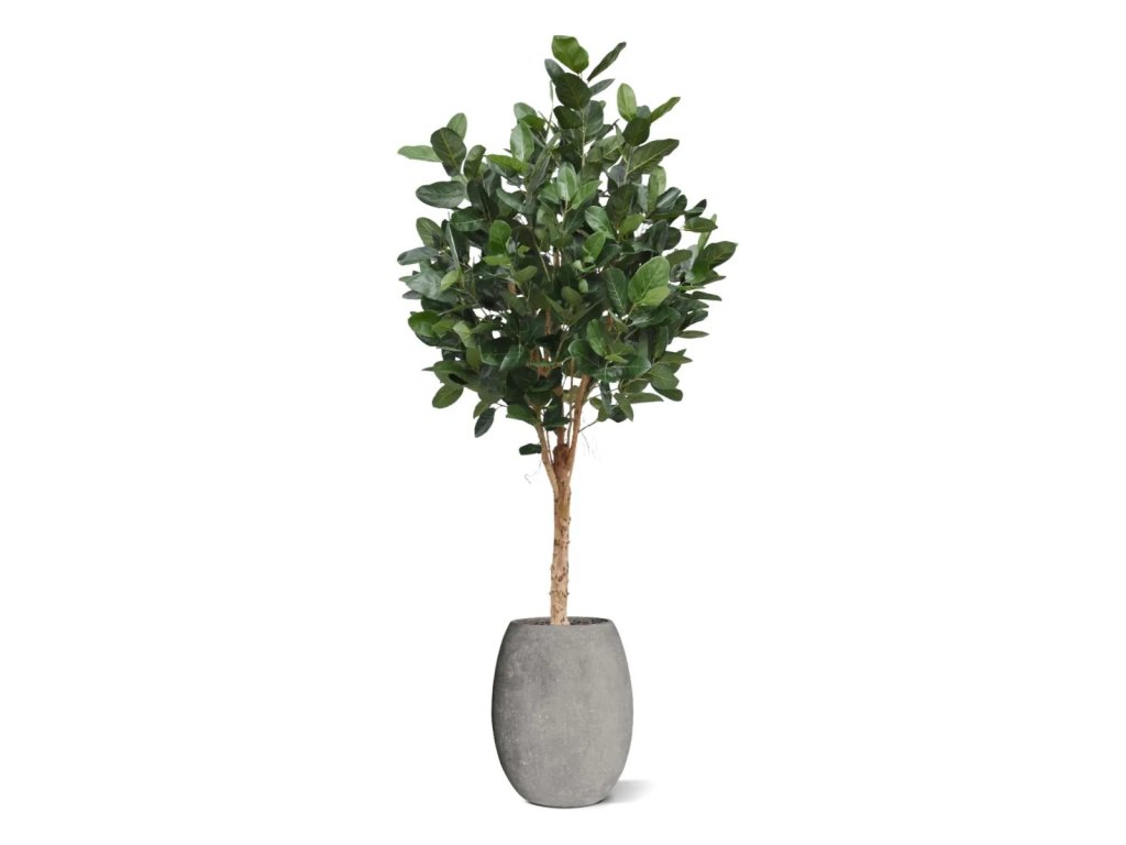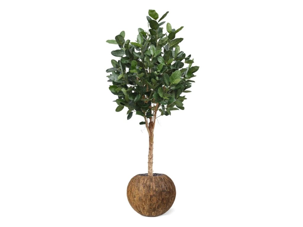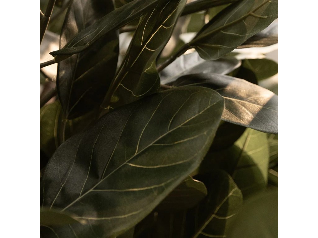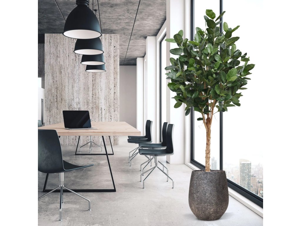 Špičková imitace fikusu s velkými listy. Kmen vyroben z přírodního dřeva. Standardně dodáváno v plastovém květináči.