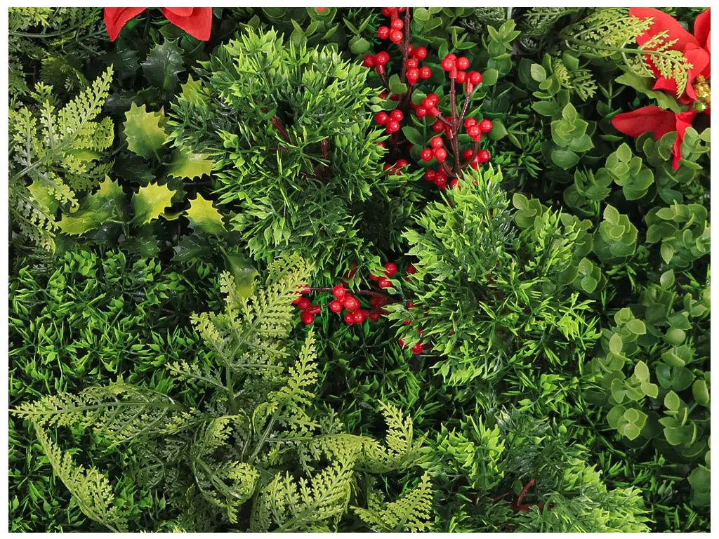 Této zelené stěně dominuje červená vánoční hvězda doplněná o červené bobule.