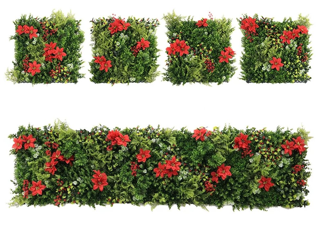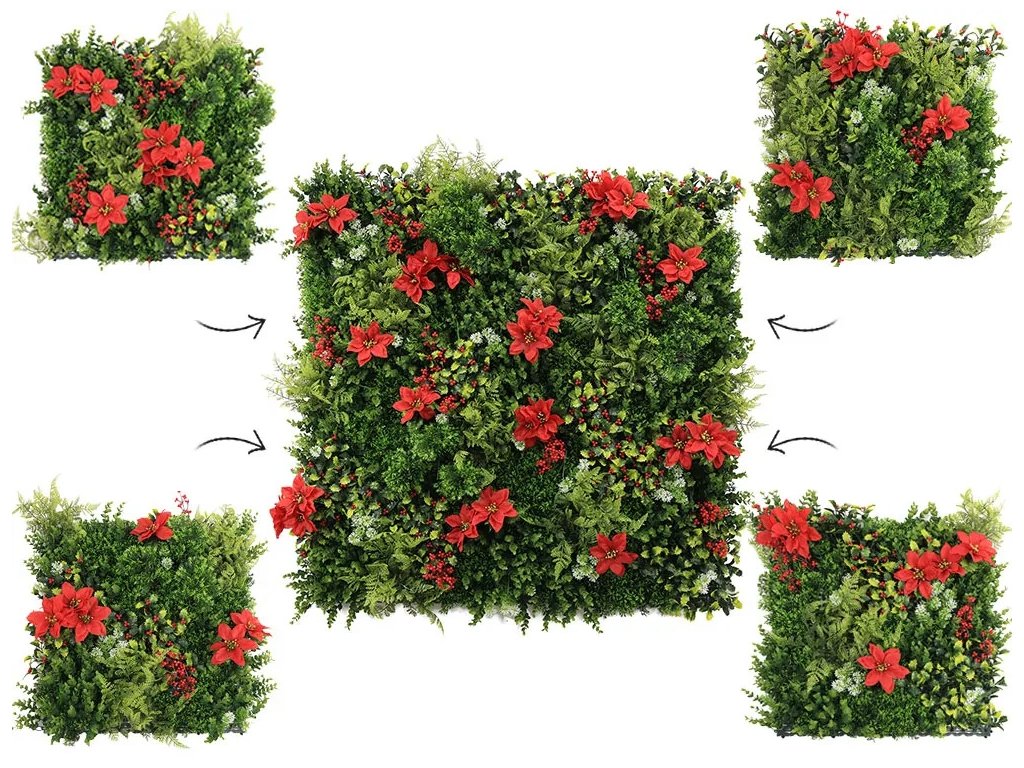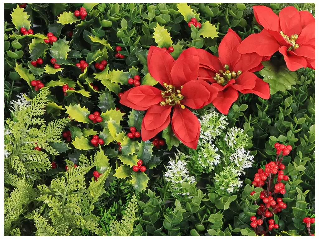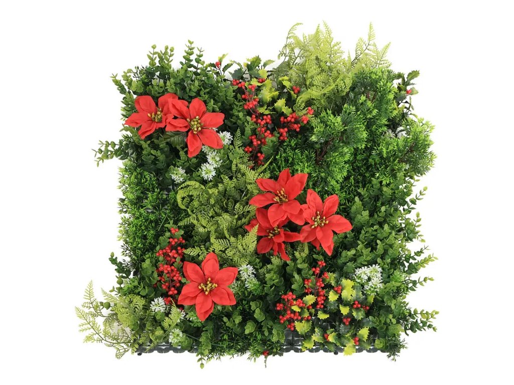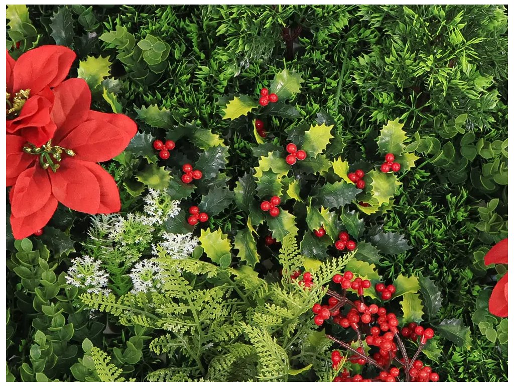 Této zelené stěně dominuje červená vánoční hvězda doplněná o červené bobule cesmíny a mech s bílými konečky.