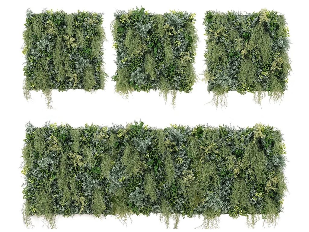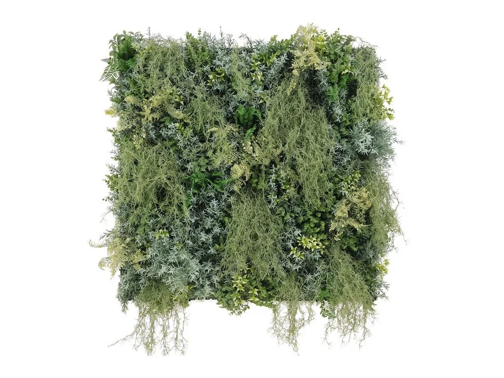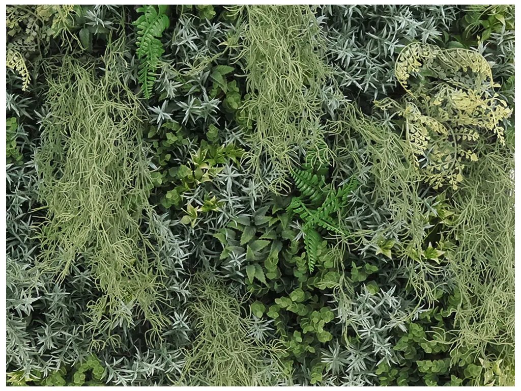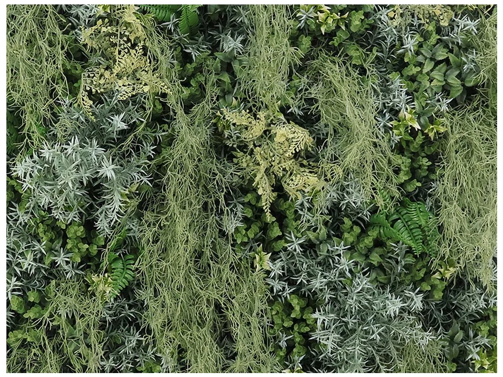 Decentní zelená stěna s dominantním španělským mechem (tilandsií) doplněná o listy pelyňku a dalších rostlin.
